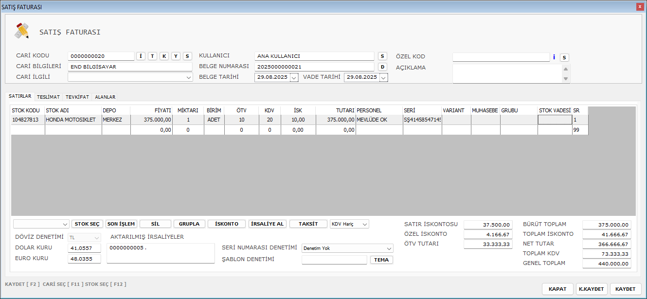 Evet, Bilindiği üzere ülkemizde özel tüketim vergisi olan emtialar oladuğundan dolayı faturaya ÖTV eklemek zorunda kalıyoruz. Bu durumda programdan özel tüketim vergili fatura kesebililirmeniz için fatura satırlarındaki ÖTV alanına istenilen oranı girebilirsiniz. Bu durumda faturanız otomatik vergi hesaplamalarını yapacaktır.