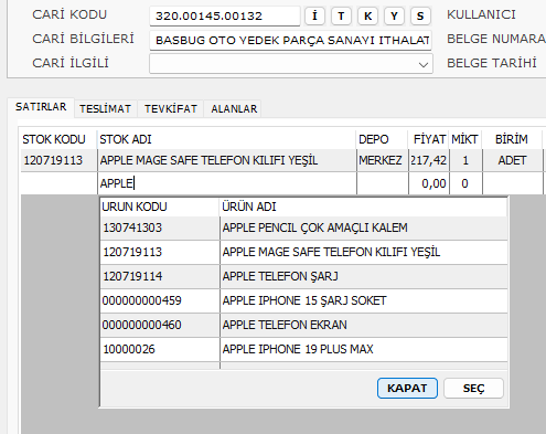 Evet. fatura hızlı arama özelliğini açar iseniz kayıt ekleme satırına stok adını yazmaya başladığınız anda program stok önerileri sunmaya başlayacaktır. Bu özellik sayesinde normal bir fatura kesme süresini 3 kat daha hızlandırabilirsiniz.